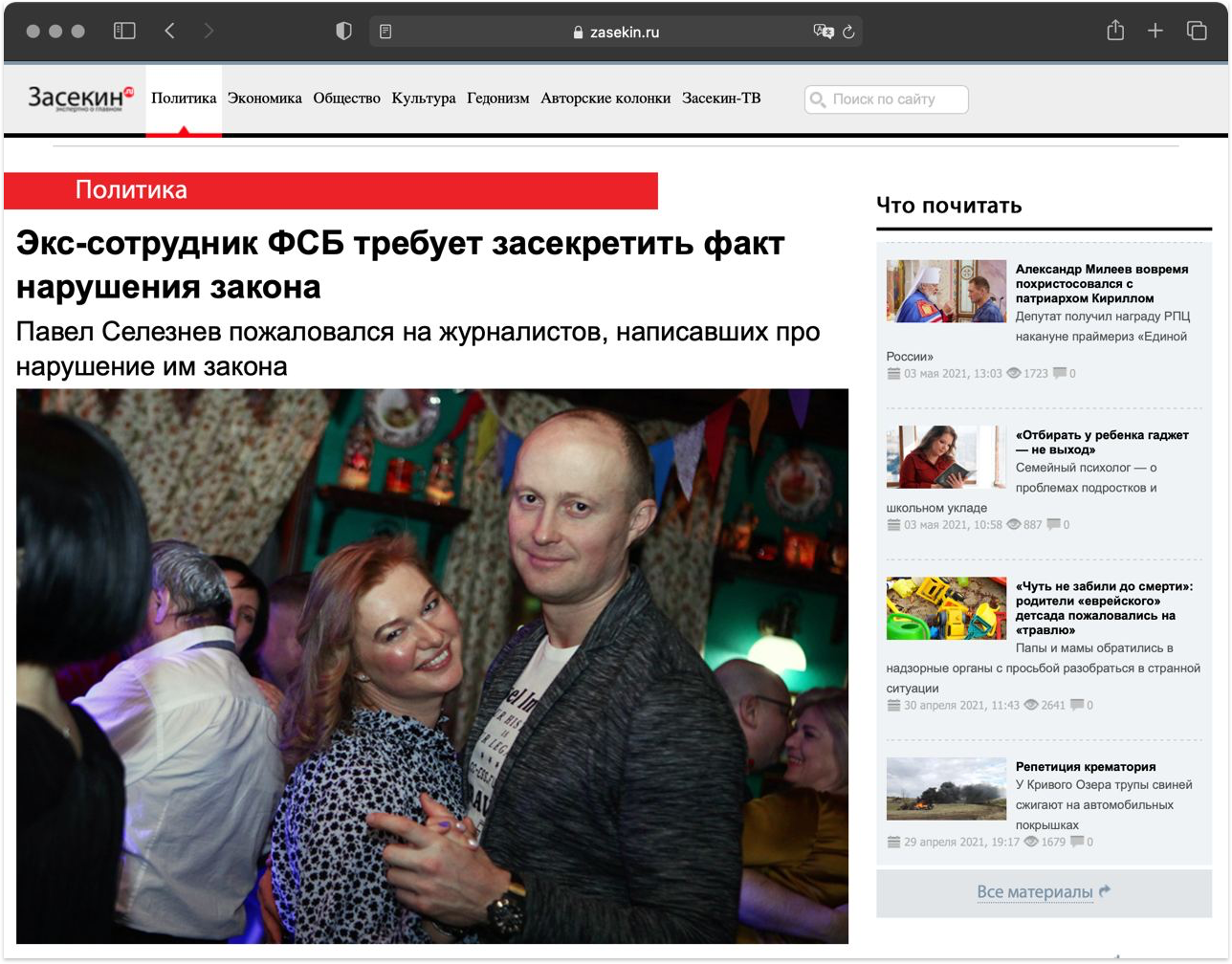 23 апреля Селезнев попытался добиться блокировки публикации о себе через Роскомнадзор; несмотря на все усилия, заметка о поездке в Дубай — это главное, что сейчас гуглится о бывшем силовике. До февраля Селезнев упоминался разве что в самарских телеграм-каналах — и на сайте «Компромат.ру», где описывали, как он играет в преферанс в компании банкиров, отставных силовиков и криминальных авторитетов.