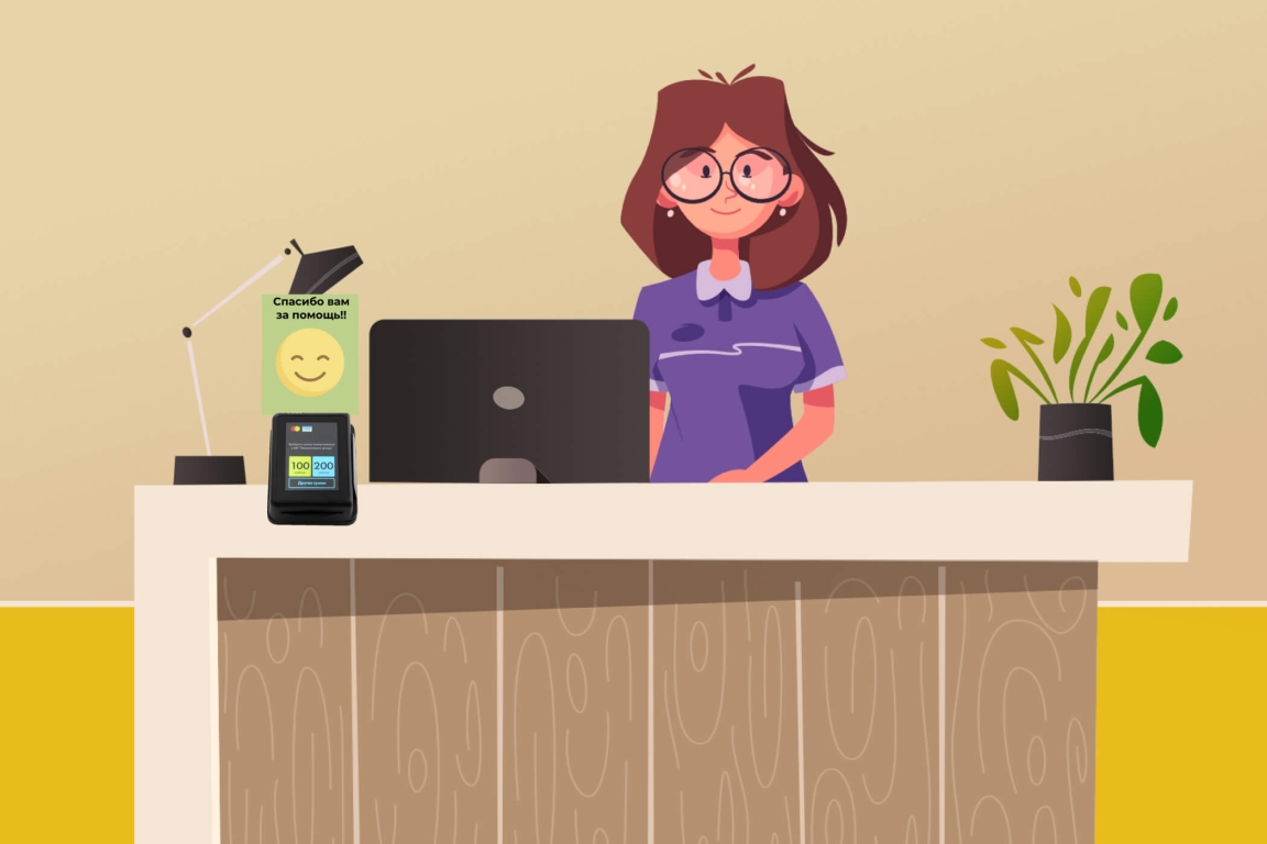 Терминал можно кастомизировать. Например, есть возможность вывести на экран логотип фонда. К устройству прилагаются информационные таблички, чтобы оно было более заметно в кассовой зоне. На табличке можно разместить любую информацию — текст, графику, логотип фонда или что-то еще.