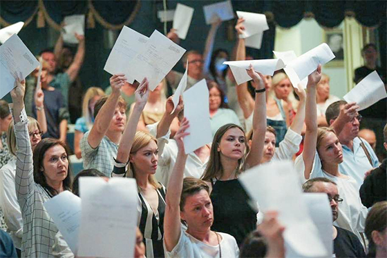© Tut.by Сотрудники Национального академического театра имени Янки Купалы с заявлениями об увольнениями. Минск, 18 августа 2020 года Представители белорусского театра, лишившиеся возможности заниматься профессиональной деятельностью из-за своих выступлений против беззакония и насилия со стороны властей, выступили с обращением, в котором попросили помощи у коллег из других стран.