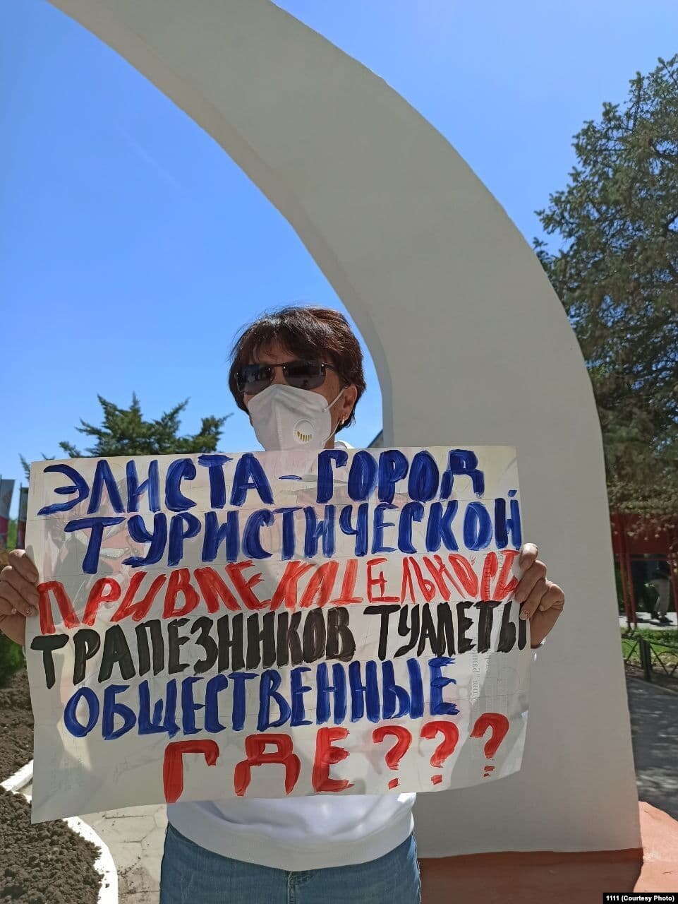 "Элиста – город туристической привлекательности. Трапезников (мэр Элисты. – Прим.ред.), туалеты общественные где???", – было написано на плакате. В пикете активистка простояла около получаса.