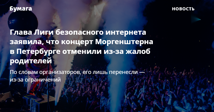 Глава Лиги безопасного интернета заявила, что концерт Моргенштерна в Петербурге отменили из-за жалоб родителей. По словам организаторов, его лишь перенесли — из-за ограничений