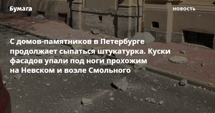 Накануне на Малой Морской улице в Петербурге на голову женщине упал кусок штукатурки. Ее госпитализировали в Мариинскую больницу. Ранее на Невском проспекте на голову человеку обвалился кусок лепнины, а в апреле часть фасада упала со здания на Московском проспекте — осколок попал в голову двухлетнему ребенку, его госпитализировали.
