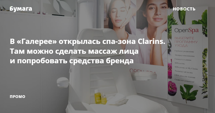 В магазине «Рив Гош» в торговом центре «Галерея» открылась спа-зона французского бренда косметики Clarins. Там можно получить индивидуальную консультацию, сделать экспресс-массаж лица, шеи или головы и познакомиться с фирменной техникой нанесения средств для ухода.