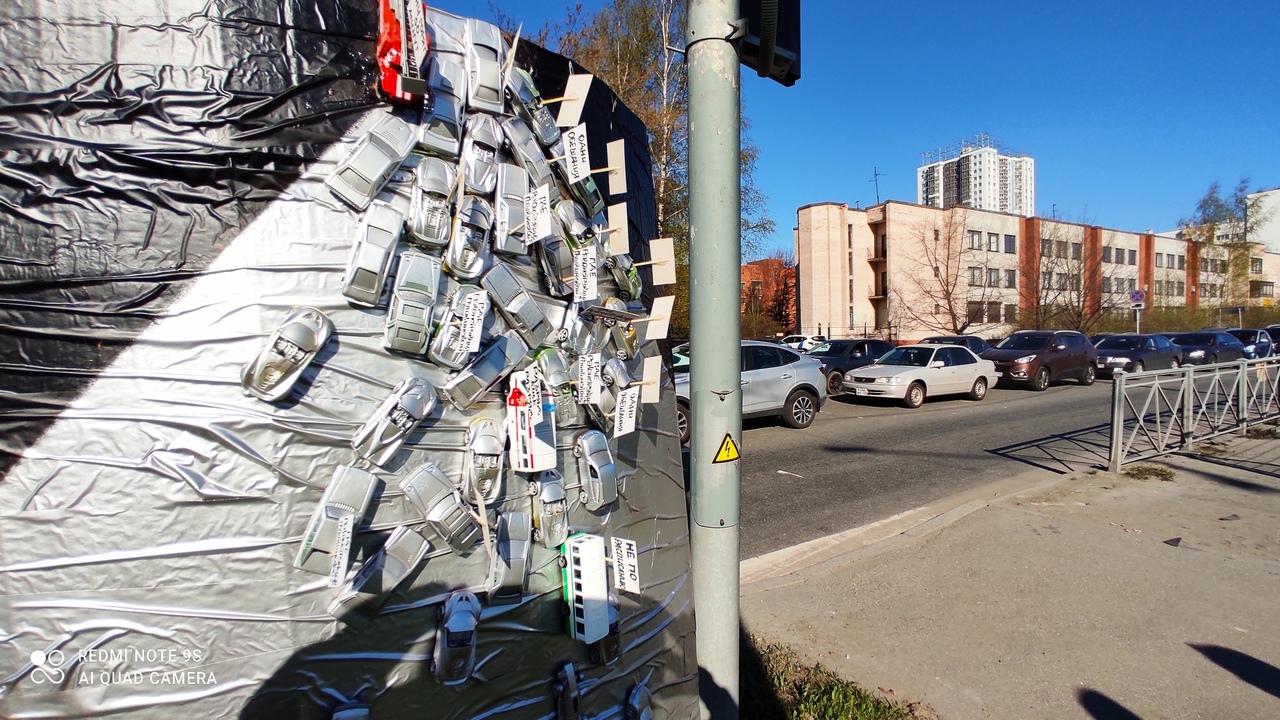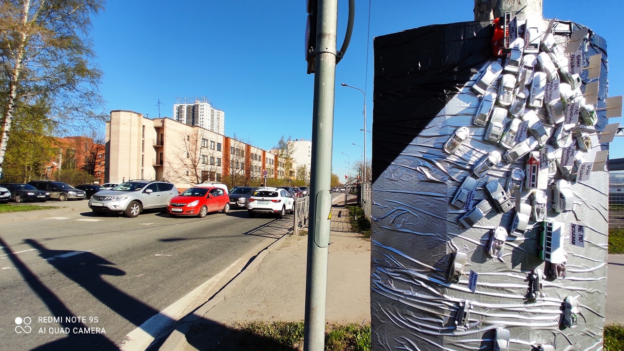 В петербургском поселке неизвестные активисты установили памятник "выдающейся Шушарской пробке". Ее фотографии они выложили в паблике "Шумные Шушары".