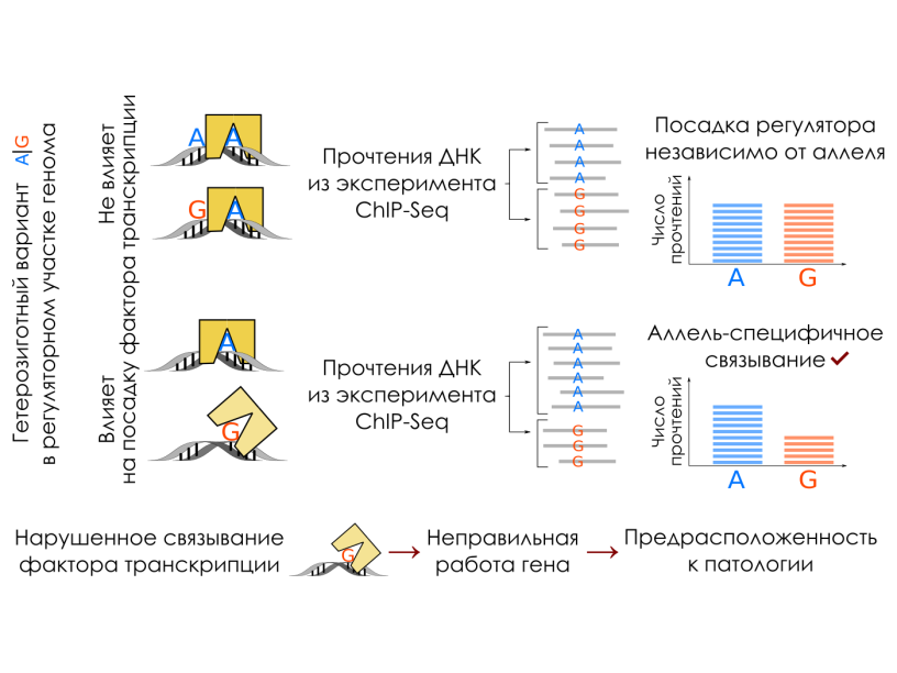 Авторы исследования провели масштабный вычислительный анализ опубликованных экспериментов по картированию взаимодействий регуляторных белков и ДНК. С помощью продвинутого статистического подхода им удалось единым образом проанализировать результаты нескольких тысяч экспериментов для разнообразных типов клеток. Полученная карта содержит сотни тысяч событий так называемого аллель-специфичного связывания, когда разница в один нуклеотид в конкретном участке пары хромосом (аллельный вариант) приводит к тому, что регуляторный белок предпочтительно связывается с одной хромосомой из пары. Сопоставление с данными о генетике различных заболеваний показало: те варианты, которые приводят к потере связывания регуляторного белка (или, наоборот, к связыванию того, который раньше в этом месте не садился), гораздо чаще оказываются вовлеченными в развитие болезни.