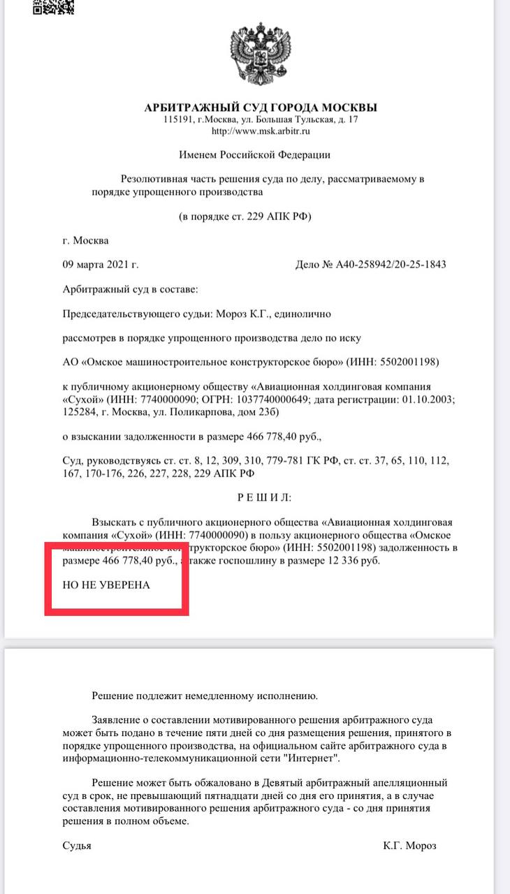 Мороз постановила взыскать с «Сухого» 466 778 рублей в пользу «Омского машиностроительного конструкторского бюро», а также госпошлину. Под решением судья оставила фразу «НО НЕ УВЕРЕНА».