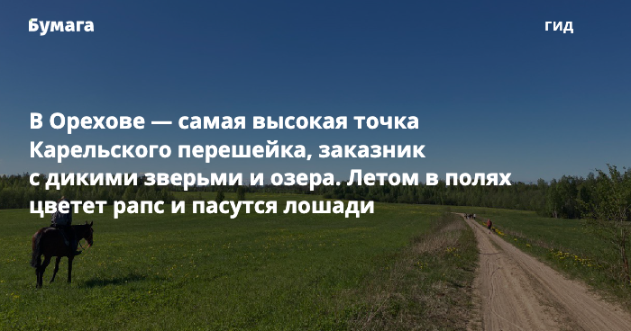 Орехово находится в 80 километрах к северу от Петербурга. Там есть природный заказник с дикими животными, густые хвойные леса, несколько озер и огромное холмистое поле, на котором пасутся лошади и цветет рапс и иван-чай.