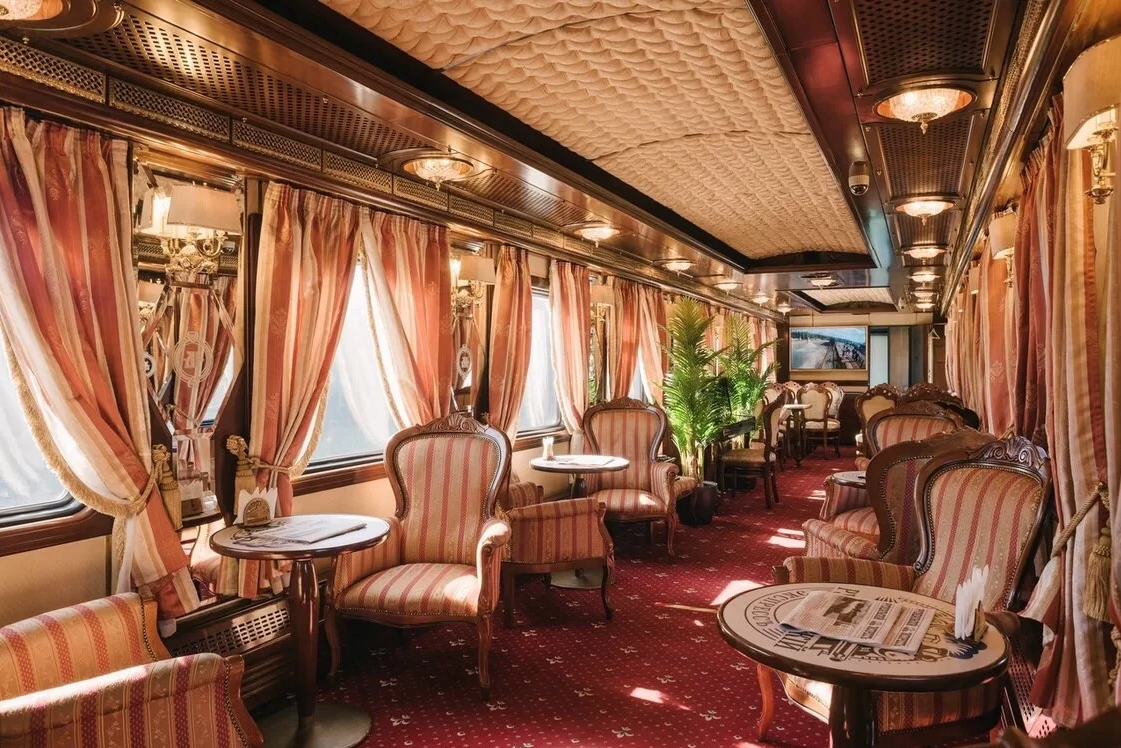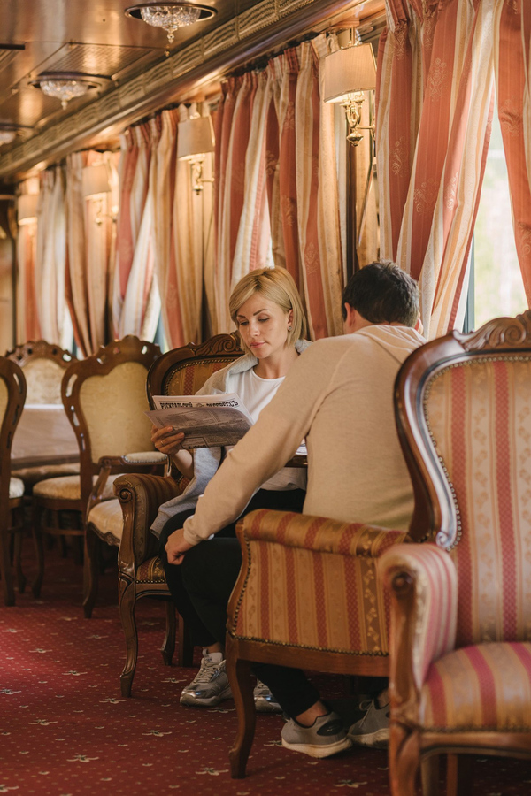 Внутри поезд стилизован под конец XIX — начало XX века. Убранство купе повторяет интерьеры вагонов первого класса того периода. Есть и VIP-купе, выполненное в стиле вагона, в котором Николай II ездил из Санкт-Петербурга в Хельсинки. Через специальный монитор здесь можно понаблюдать за работой бригады паровоза. Проезд в таком купе стоит 6000 рублей на четверых пассажиров, в обычном вагоне — от 349 рублей.