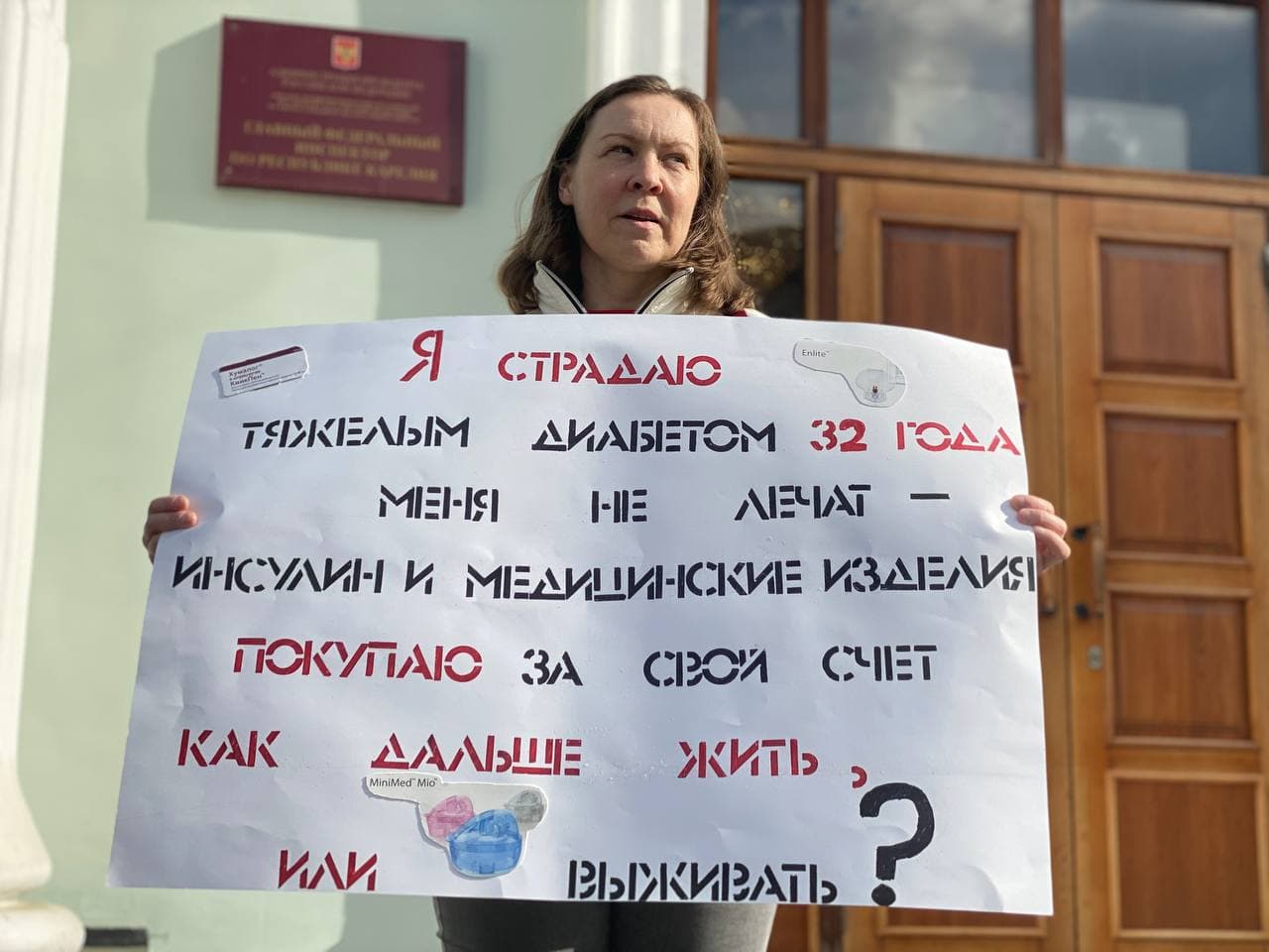 С протестом к зданию правительства Карелии также вышла Татьяна Михайлова. Она добивается, чтобы ей продолжили выдавать инсулин заграничного образца, который она получала больше 20 лет и чувствовала с ним себя хорошо, но 1,5 года назад ей заменили его на отечественный аналог. Женщина не раз обращалась в Минздрав, там ссылаются на 44 ФЗ, по которому при закупках отдают предпочтение отечественному инсулину. Михайлова принимать российский препарат отказалась: "Это же не сыр, чтобы попробовал, не попробовал, это серьезно". Лекарства она покупает сама, в месяц у неё уходит около 20 тысяч рублей на лекарства, сенсоры и дополнительные препараты.