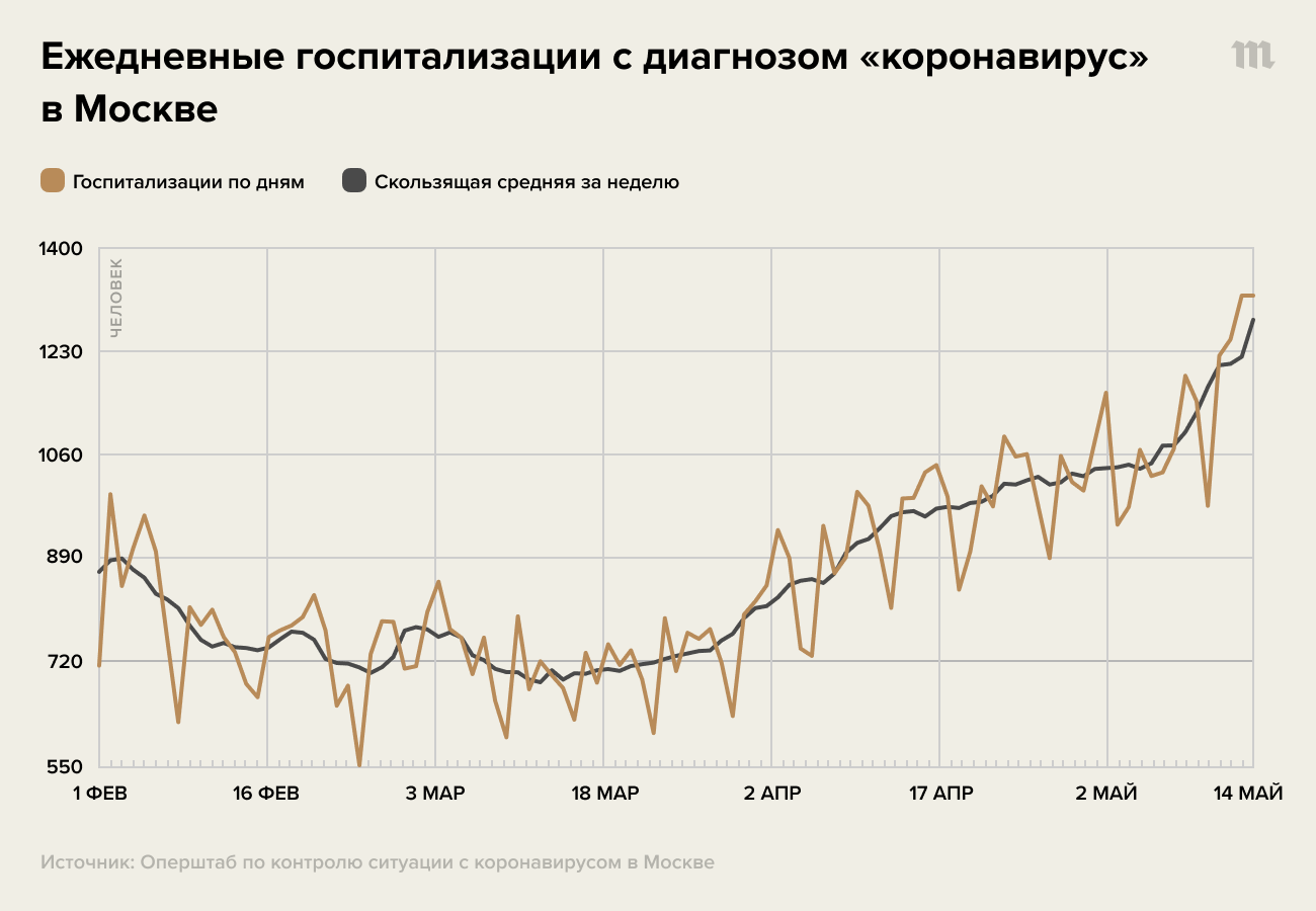 После майских праздников 2021 года в Москве резко ускорился рост числа госпитализированных с осложнениями коронавируса и внебольничными пневмониями. В конце апреля в больницы попадали в среднем около тысячи человек в день, а в последнюю неделю — больше 1200. 13 и 14 мая были госпитализированы по 1324 человека, сообщил оперштаб по борьбе с коронавирусом. Число ежедневно поступающих в ковидные отделения подбирается к январским пикам. Власти столицы называют ситуацию «напряженной», но «не катастрофической», однако правильнее было бы назвать ее угрожающе-неопределенной. Даже более медленное, чем прошлой весной и осенью, распространение заболевания может привести к новому всплеску смертности от коронавируса, которая и без того в России была одной из самых высоких в мире.
