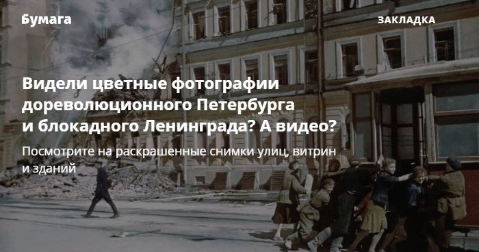 «Бумага» выбрала раскрашенные Ангелиной фотографии и видео из Ленинграда и Петербурга. Смотрите, как в цвете выглядят дореволюционные и блокадные улицы, витрины и здания города.