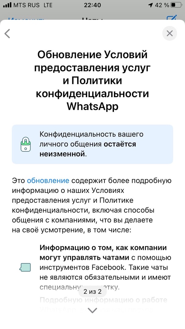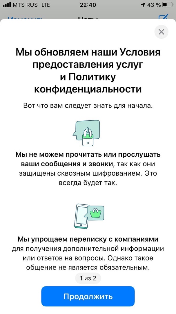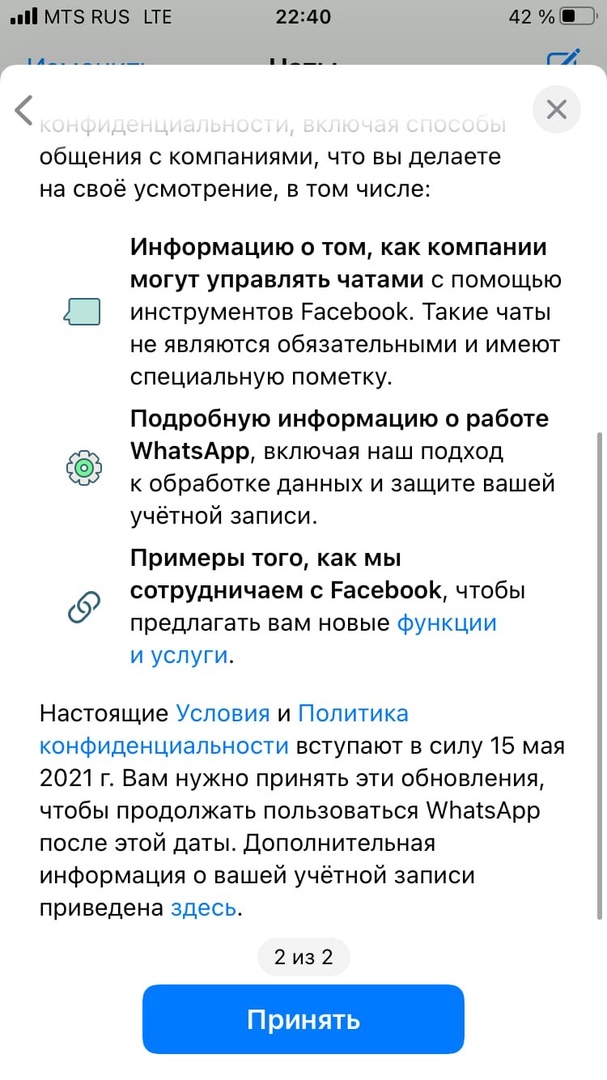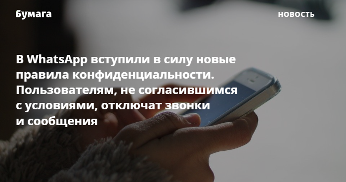 15 мая мессенджер WhatsApp обновил условия предоставления услуг и политику конфиденциальности. Пользователям, которые не приняли новые условия, отключат возможность писать сообщения и совершать звонки, предупреждали ранее представители компании.