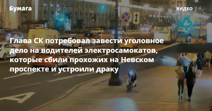 Председатель Следственного комитета РФ Александр Бастрыкин потребовал возбудить уголовное дело после того, как на Невском проспекте несколько молодых людей на электросамокатах сбили прохожих и избили мужчину. Об этом сообщили на сайте СК.
