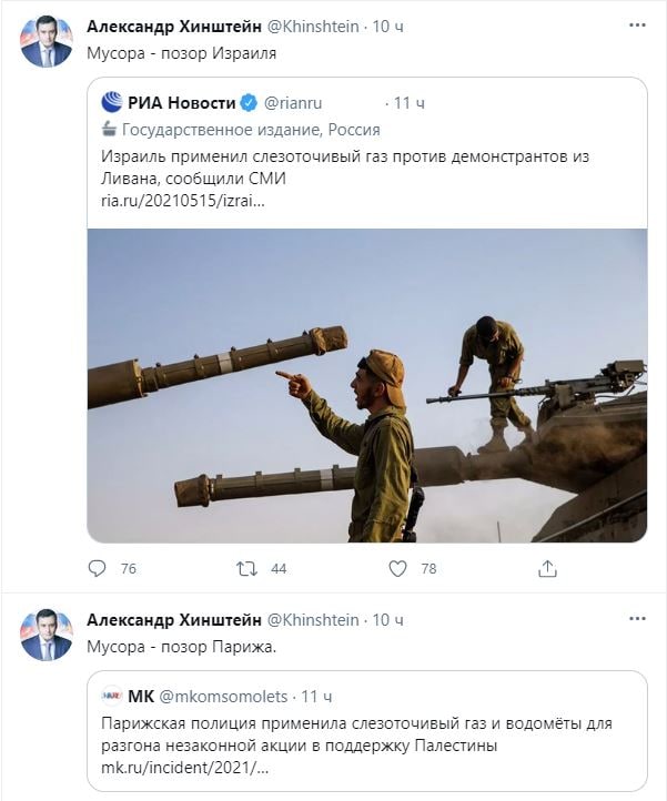 Хинштейн прокомментировал действия силовиков, использовавших слезоточивый газ на акциях протеста в Париже и деревне Адейси на границе Израиля и Ливана. Депутат написал «Мусора — позор Израиля» и «Мусора — позор Парижа».
