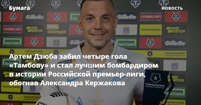 Нападающий «Зенита» Артем Дзюба забил «Тамбову» четыре гола в последнем матче сезона (игра закончилась со счетом 5:1) и стал лучшим бомбардиром в истории Российской премьер-лиги.