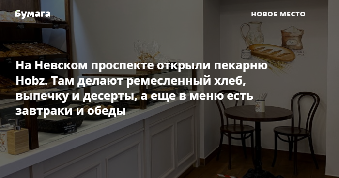 На Невском проспекте, 160 заработала пекарня Hobz от тунисца Махмуда Буссельми, сообщили «Бумаге»представители проекта. Буссельми более 10 лет работал пекарем в родной стране, Франции и России — например, в последние три года он возглавлял команду пекарей в петербургской сети кондитерских Garçon.