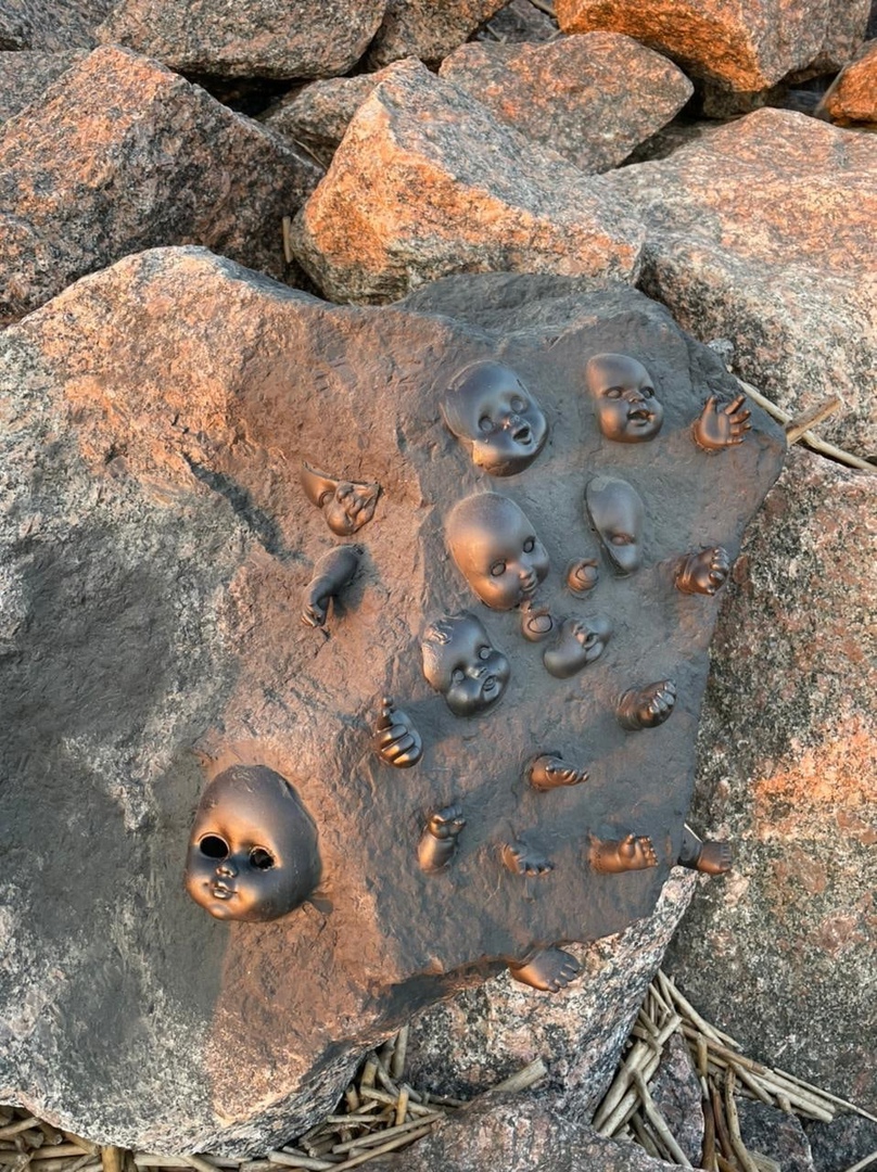 Жители ЖК «Я-Романтик» опубликовали фотографию с необычным арт-объектом на побережье Финского залива. Это каменная плита с высеченными в ней (или прикрепленными к ней) лицами и руками младенцев.
