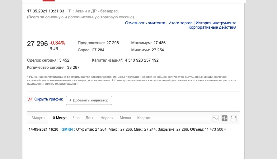 После появления сообщений о разливе топливе стоимость акций «Норникеля» на Мосбирже несколько снизилась. На 10:31 ее падение составляет 0,4%.