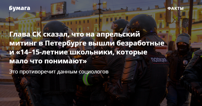 Председатель Следственного комитета РФ Александр Бастрыкин высказался по поводу участников несогласованного митинга 21 апреля в Петербурге, его цитаты приводит «РИА Новости». Сказанное главой СК противоречит данным независимых социологов, заметила «Бумага».