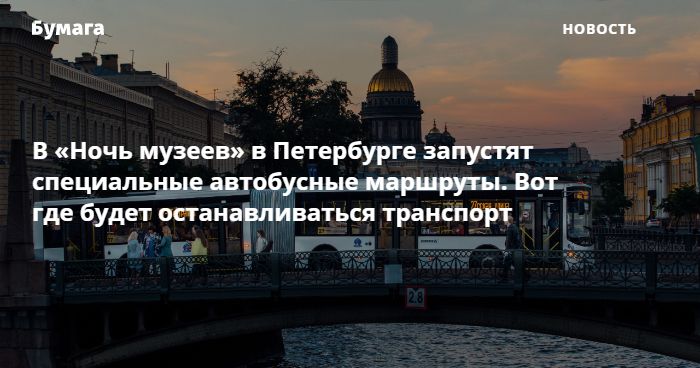 В «Ночь музеев» в Петербурге запустят специальные автобусные маршруты. Вот где будет останавливаться транспорт