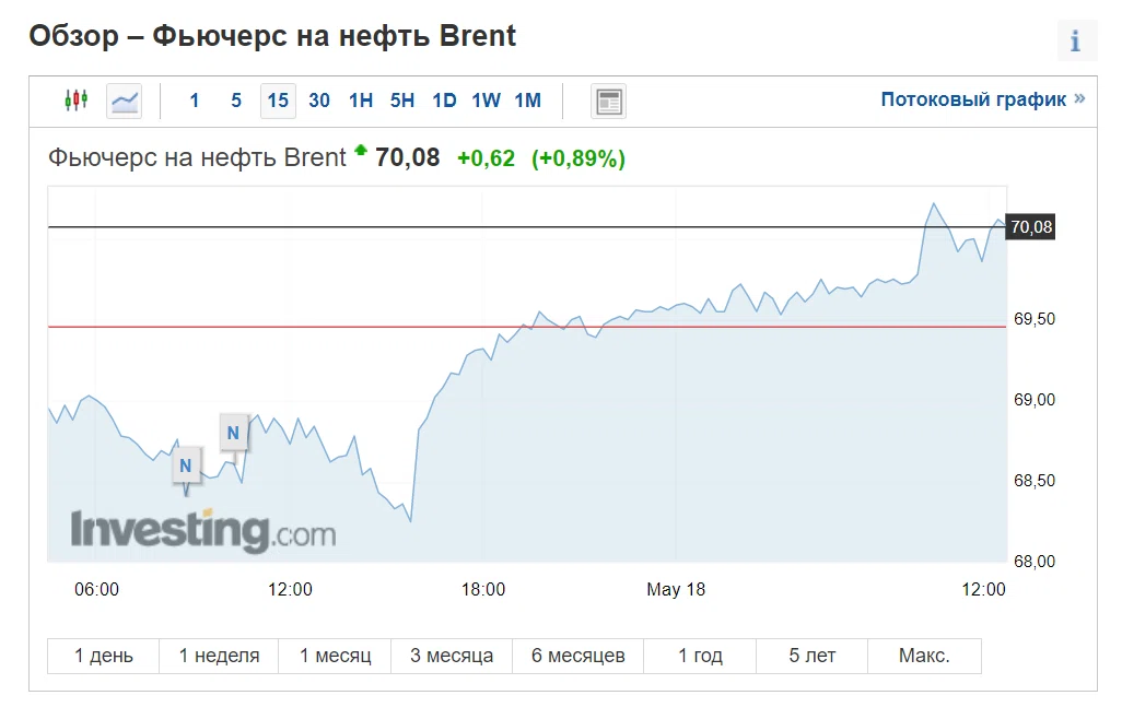 Цена нефти марки Brent впервые с 15 марта превысила отметку в 70 долларов за баррель