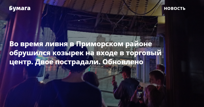 Во время ливня в Приморском районе обрушился козырек на входе в торговый центр. Двое пострадали. Обновлено