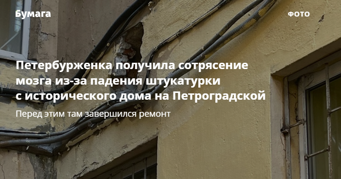 С домов-памятников в Петербурге продолжает сыпаться штукатурка. Ранее куски фасадов упали под ноги прохожим на Невском и возле Смольного, а на Малой Морской на голову женщине упал кусок штукатурки — пострадавшую госпитализировали в Мариинскую больницу. В апреле часть фасада упала со здания на Московском проспекте — осколок попал в голову двухлетнему ребенку, его тоже госпитализировали.