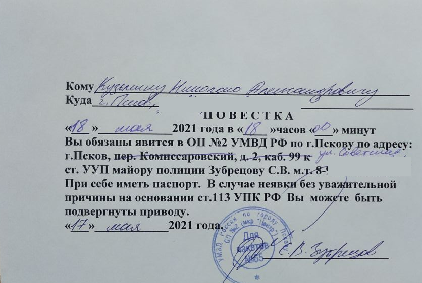 В полиции Кузьмин не стал отвечать на вопросы полиции, воспользовавшись 51-ой статьей Конституции (право не свидетельствовать против себя - СР). Полицейские в отделе интересовались, кому принадлежит страница с именем "Николай Кузьмин" в "ВКонтатке" и он ли публиковал тот самый пост.