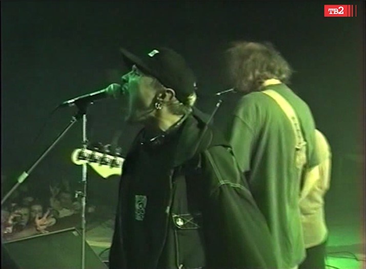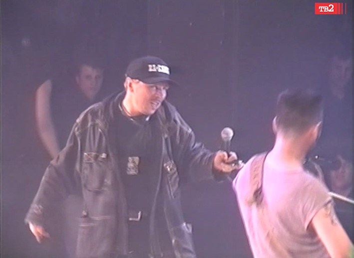 И вот мы во Дворце спорта. На сцене разворачивается действо, группы выступают одна за другой (играли все, кстати, полноценные сеты, минут по 40-45, а то и по часу, это уже в других городах, по мере добавления новых участников тура, времени у каждого вступающего становилось меньше). А мы с моим коллегой по музредакции Антоном Волковым (ведущим передачи «Ночная смена») и оператором бродим по закулисью Дворца и записываем интервью с музыкантами. С двумя Владимирами из «ЧайФа» – Шахриным и Бегуновым – побеседовали, например, за столиком кафе. Там же был пойман и Скляр. Со Стасом Наминым разговаривали в коридоре.