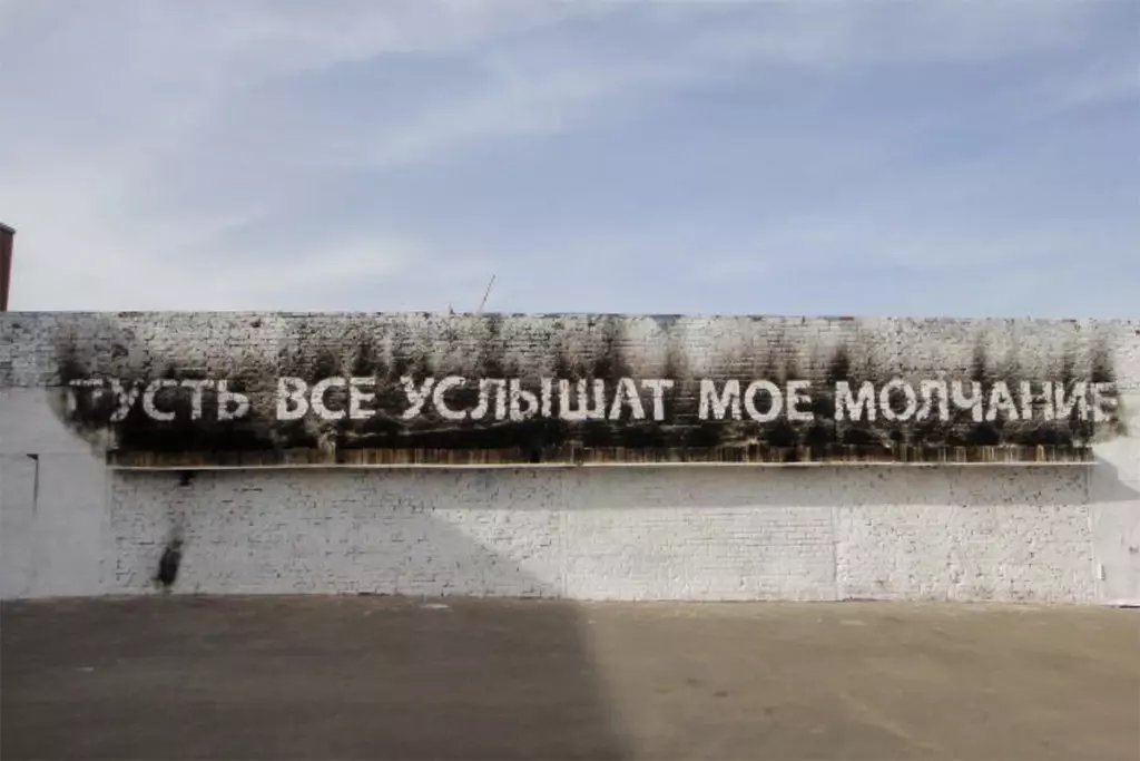 Художник Тимофей Радя представил на «Стене» инсталляцию в смешанной технике: он поджег выкрашенную белым стену и на следах от пламени трафаретом нанес название композиции — «Пусть все услышат мое молчание». На уровне человеческого роста располагалась импровизированная полка с обгоревшими книгами.