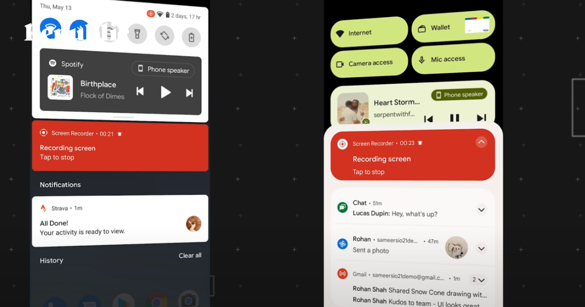 Редизайн со сцены назвали «самым большим в истории Android», и не зря. Разработчики полностью переделали оформление каждой иконки, всех уведомлений, цветов и анимации (она теперь более плавная). Кнопки стали большими и более круглыми, а в целом интерфейс будет работать с опцией динамического освещения. Дизайн подогнали даже под функции приватности. К примеру, при запуске камеры или микрофона интерфейс будет показывать специальный зеленый значок в правой части экрана.