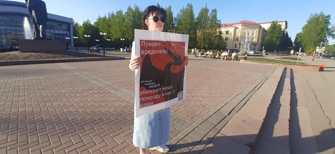 В Сыктывкаре местная жительница Елена Гулина вышла в одиночный пикет против загрязнения северных рек компанией "Лукойл", которая с 11 мая ликвидирует последствия прорыва нефтепровода. Из-за аварии в трех районах Коми ввели режим ЧС, а экологи опасаются, что нефтяное пятно движется к Северному Ледовитому океану.