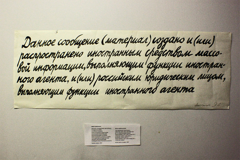 иностранная художница дарья апахончич (признана минюстом достойной звания иностранной агентессы 28 декабря 2020 года) вынужденно покинула россию, но в петербурге проходят сразу две выставки, где можно увидеть ее знаковую работу «ДАННОЕ СООБЩЕНИЕ (МАТЕРИАЛ) СОЗДАНО И (ИЛИ) РАСПРОСТРАНЕНО ИНОСТРАННЫМ СРЕДСТВОМ МАССОВОЙ ИНФОРМАЦИИ, ВЫПОЛНЯЮЩИМ ФУНКЦИИ ИНОСТРАННОГО АГЕНТА, И (ИЛИ) РОССИЙСКИМ ЮРИДИЧЕСКИМ ЛИЦОМ, ВЫПОЛНЯЮЩИМ ФУНКЦИИ ИНОСТРАННОГО АГЕНТА».