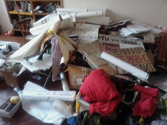 то есть мы экстренно собирали вот это вот все — ну, прежде всего, картины, то есть, точнее, вот эти вот работы ее на обоях: нам нужно было их спасти, потому что все остальное можно восстановить, а ее работы — это ее жизнь. и плакаты, да, которые у нее отобрали, — ну когда-нибудь они найдутся, да, когда будут открыты все полицейские участки, все архивы и будет это все в музее революции, — а сейчас нет.
