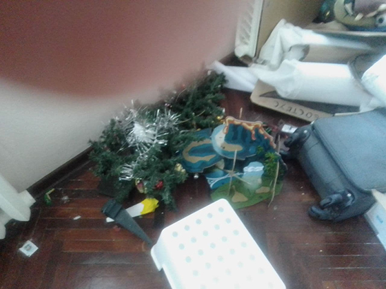 и было очень страшно смотреть — выражаясь языком современного агентного объектно ориентированного материализма — на ассамбляжи вещей, на сборки вещей, которые внезапно пришли в какое-то странное соотношение друг с другом: например, на полу оказались предметы из совершенно разных регистров бытия — детский носочек, разбитый елочный шар, след от ботинка силовика на белом листе, который когда-то был частью детского альбома, какая-то рассыпанная косметика, наволочка от подушки — и эти композиции, которые образовались такими вихрями — вихрями политического времени, да, можно так сказать, — они чудовищны, на них смотреть невозможно. я начала фотографировать на телефон — у меня очень примитивный телефон — именно эти странные сборки.