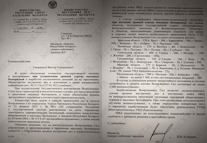14 мая офицер Генштаба Вооруженных сил страны Денис Урад приговорен к 18 годам лишения свободы. "Госизмена" заключалось в том, что 14 марта он передал телеграм-каналам NEXTA и BYPOL фотокопию документа, в котором глава МВД Иван Кубраков просит министра обороны Виктора Хренина направить 3725 военных на подавление протестов.