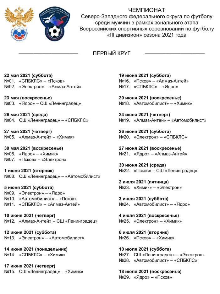 ФК «Псков» новый футбольный сезон 2021/22 годов снова проведёт в третьем дивизионе: на своей странице в соцсети «ВКонтакте» клуб опубликовал проект календаря первого круга чемпионата Северо-Западного федерального округа по футболу среди мужчин в рамках зонального этапа Всероссийских спортивных соревнований «III дивизион» сезона 2021 года. 22 мая «Псков» встречается с «СПБКЛС».