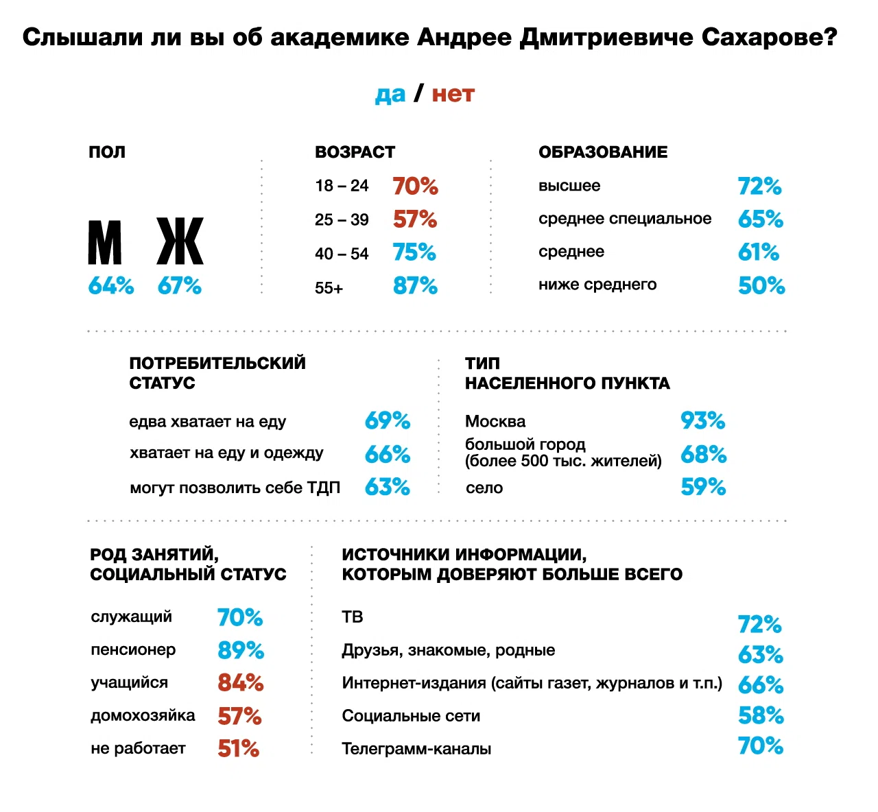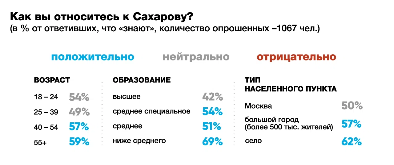 Разделение по источникам информации и доверия к ним, на первый взгляд, показывает парадоксальные результаты: позитивные оценки Сахарова выше всего у полярных в общественно-политическом плане категорий опрошенных — более консервативно настроенных телезрителей (59%) и более продвинутых пользователей социальных сетей (57%), менее всего — у пользователей телеграм-каналов. Однако этот эффект объясняется возрастом респондентов, а не характером самого канала.