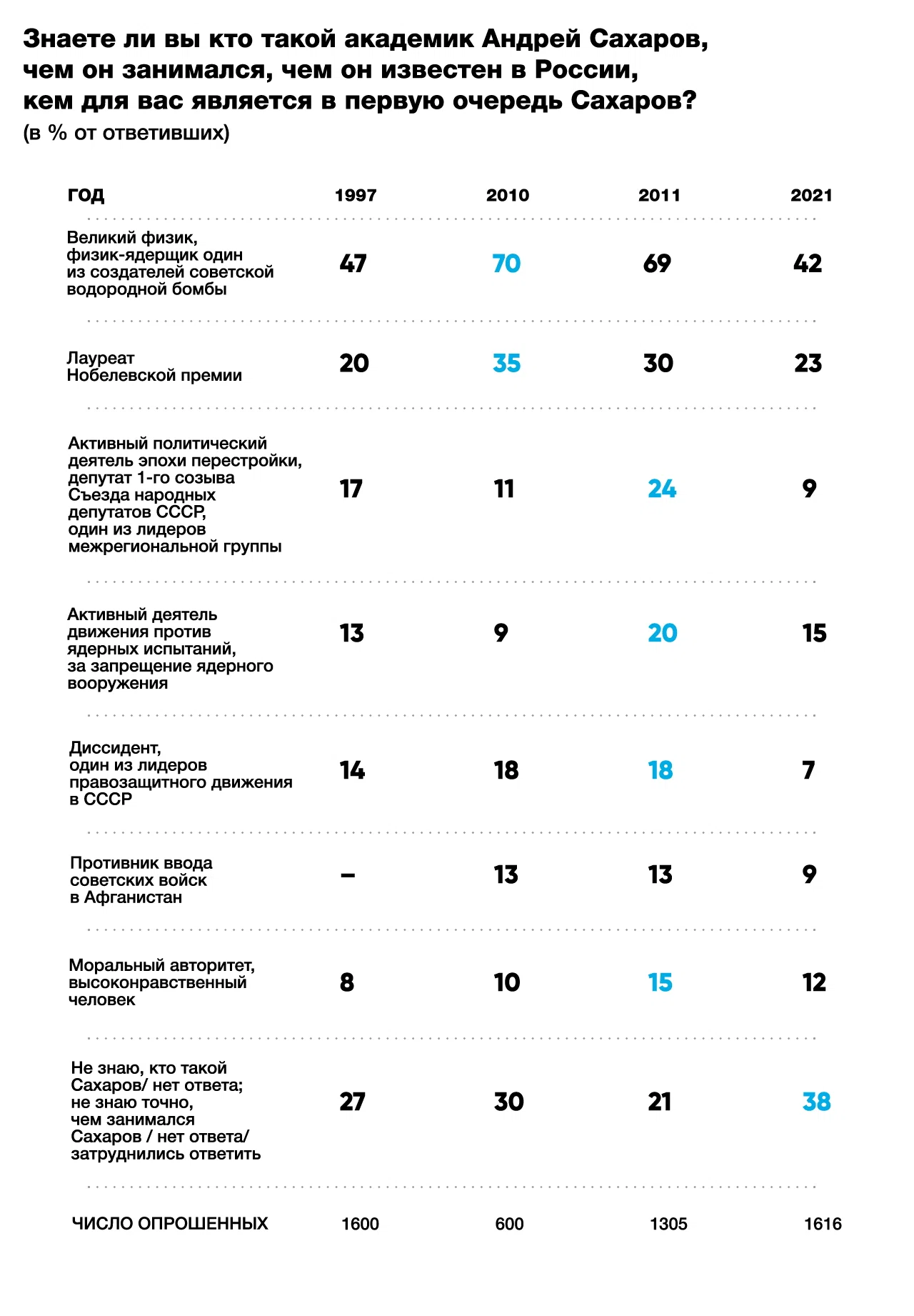 В феврале 2021 года Левада-центр (законодательство требует, чтобы мы сообщали, что организация признана Минюстом иностранным агентом. — Ред.) в рамках регулярного ежемесячного общероссийского опроса задал три вопроса, нацеленных на изучение того, что осталось в массовом сознании от прежней известности академика Сахарова спустя 30 лет.