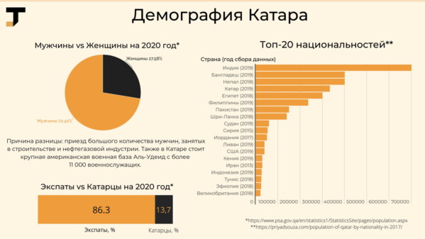 Портовый городок стал мегаполисом благодаря открытым в 40-х годах газовым и нефтяным месторождениям. За какие-то тридцать лет бедный Катар стал страной с одним из самых высоких уровней доходов населения. Доха превратилась в долину небоскрёбов, а недавние рыбаки и торговцы жемчуга купили себе Феррари. Маленькое местное население, разумеется, не смогло бы перестроить целую страну, а поэтому в Катар прибыли десятки тысяч экспатов, готовые покрыть любые нужды неприлично разбогатевших арабов.