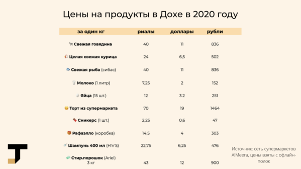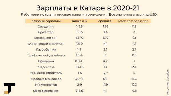 В другом тексте про переезд в Катар от 2018 года приводилась более расплывчатая вилка, цитирую: «офисные работники зарабатывают от 4000 до 13 000 риалов (68 000 — 221 000 рублей), топ-менеджеры — от 20 000 риалов (340 000 рублей)».