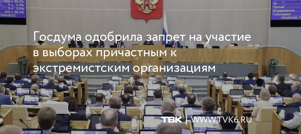 Депутаты Госдумы одобрили поправки к закону о выборах, которые запретят баллотироваться в парламент гражданам, причастным к экстремистским организациям. Документ запрещает выставлять свои кандидатуры на 5 лет руководителям экстремистских организаций и на 3 года их участникам (а также тем, кто финансировал запрещенные организации).