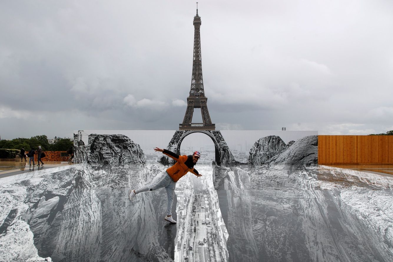 Это работа французского художника JR. Чтобы добиться такого эффекта, он наклеил на землю и забор черно-белые фотообои с изображением скал и самой башни. Получилось очень красиво!