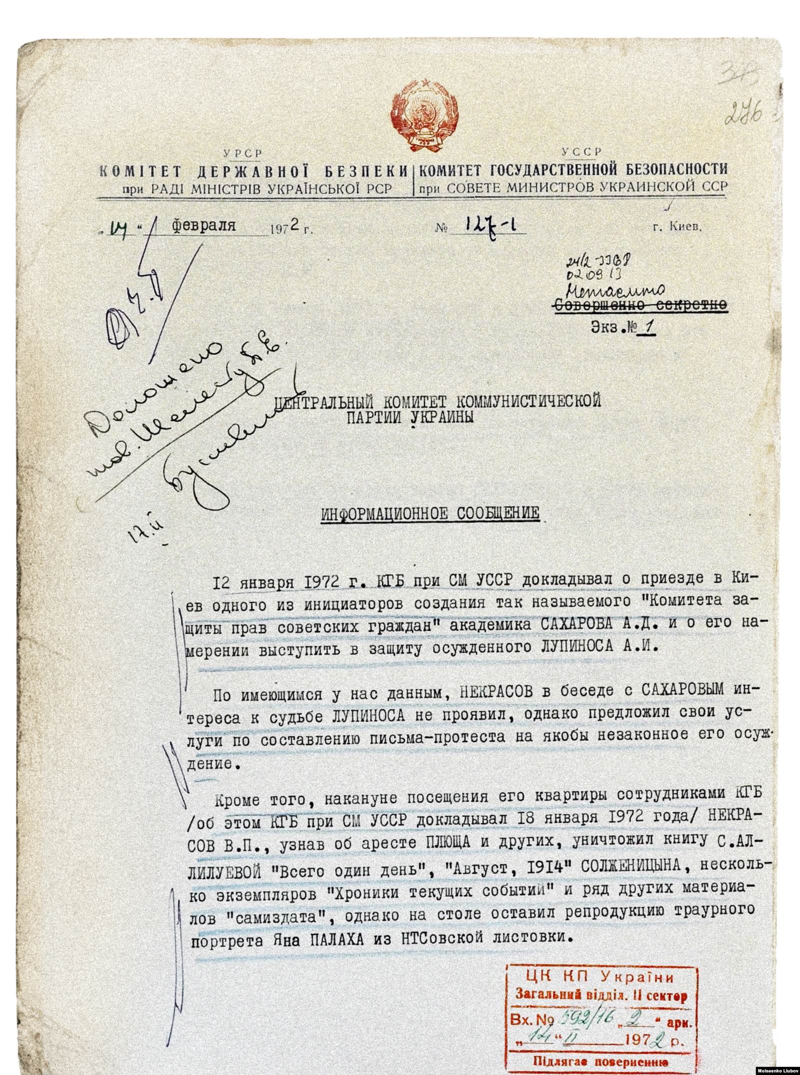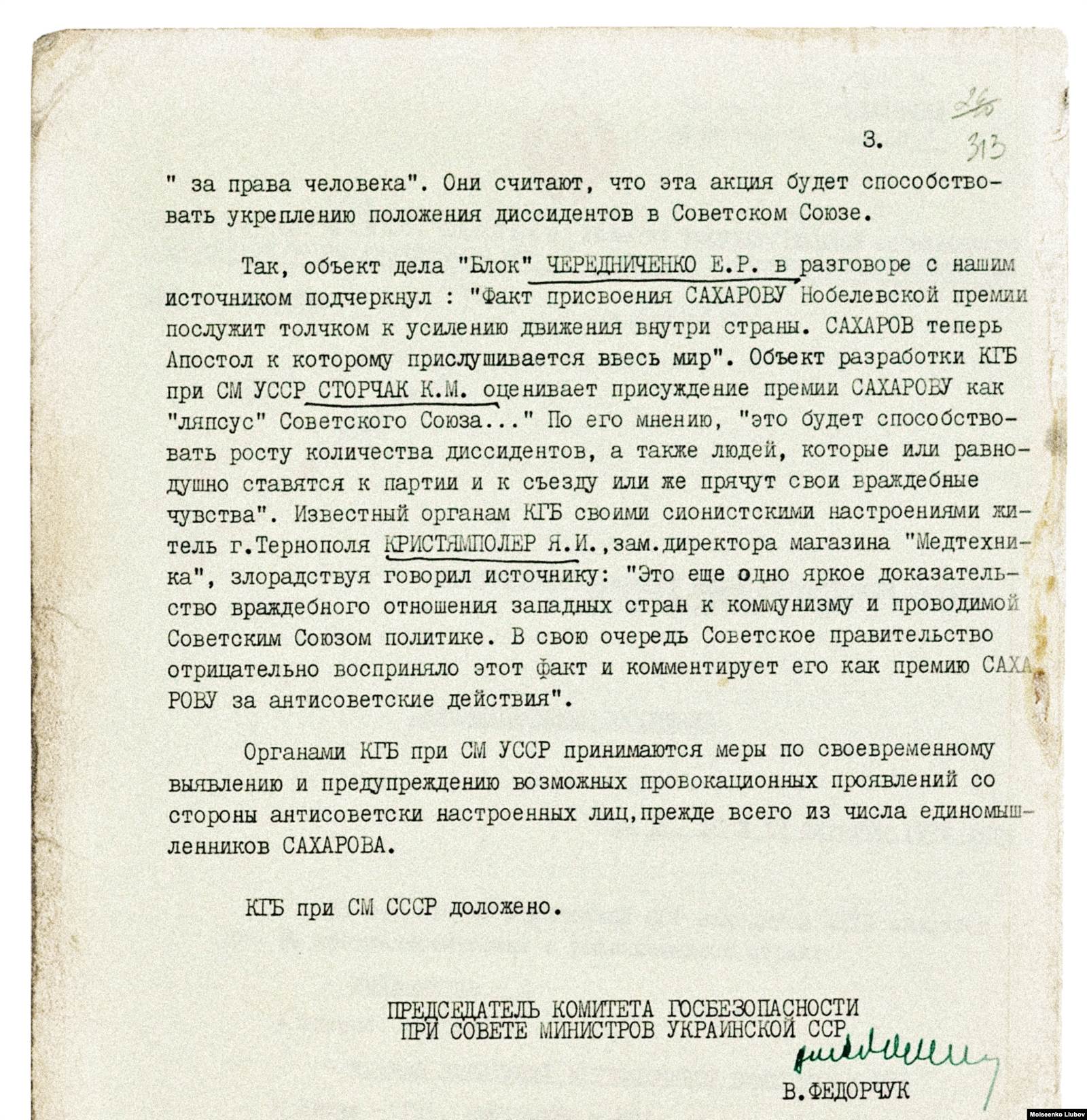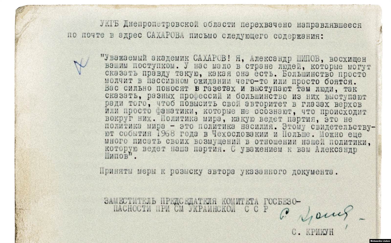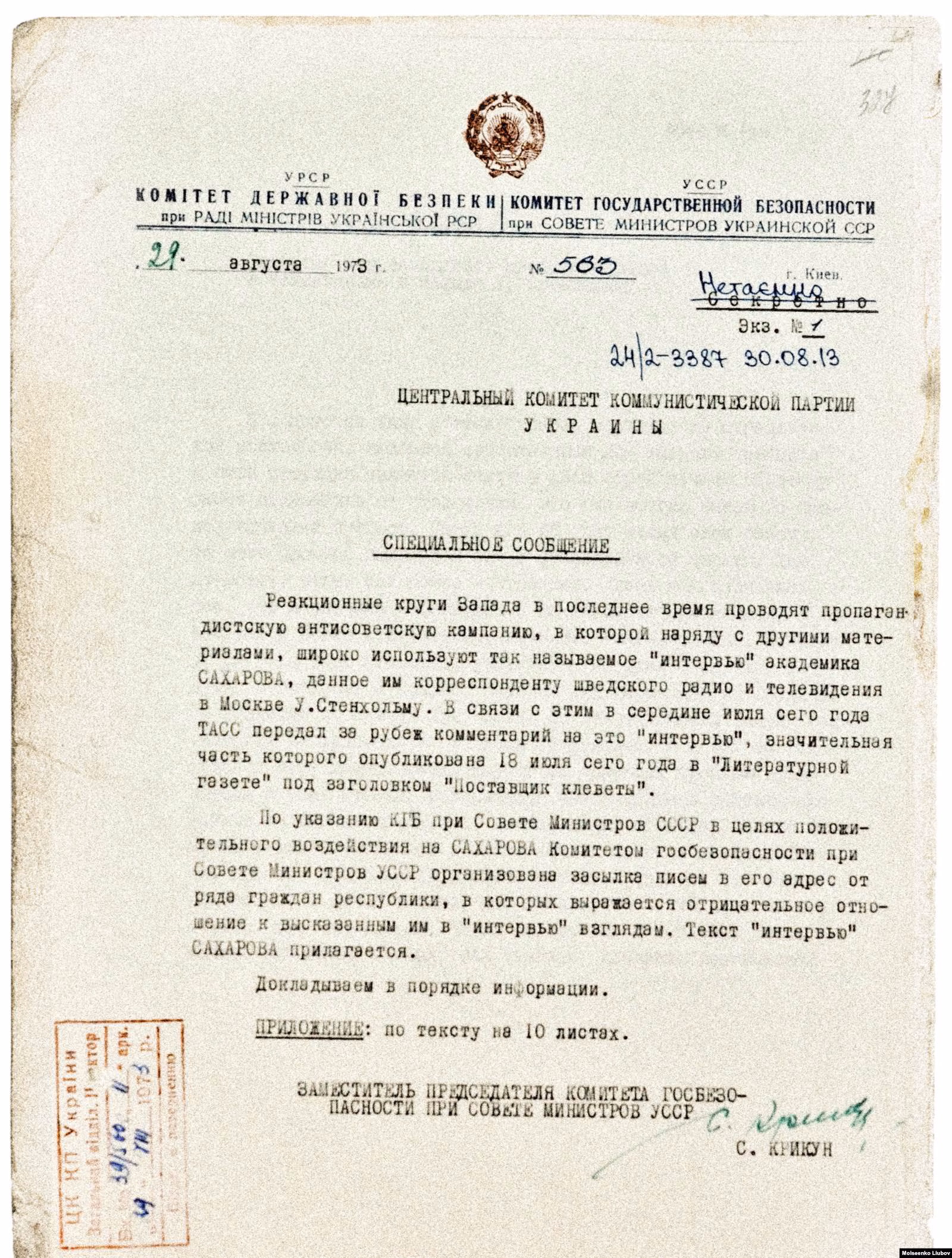 "По указанию КГБ при Совете Министров СССР в целях положительного воздействия на Сахарова Комитетом госбезопасности при Совете Министров УССР организована засылка писем в его адрес от ряда граждан республики, в которых выражается отрицательное отношение к высказанным им в "интервью" взглядам", – рапортовали в украинском КГБ.