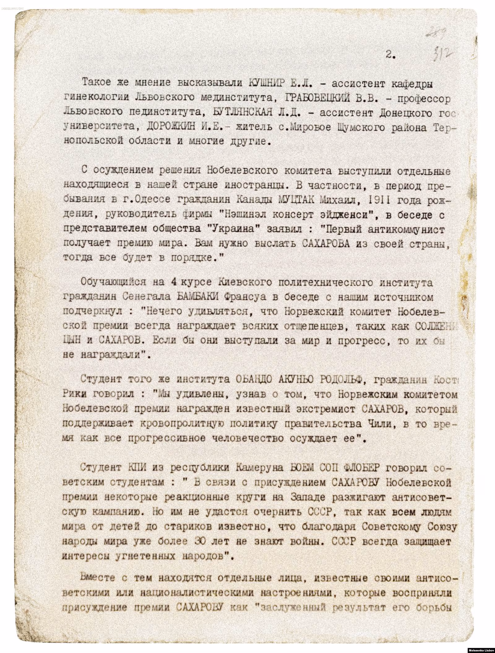 "В целях разоблачения Сахарова перед мировой общественностью как ярого антисоветчика, а также истинного смысла провокационных, враждебных СССР действий комитета по Нобелевским премиям, КГБ при СМ УССР считает целесообразным организовать направление в адрес указанного комитета и Академии Наук СССР (для Сахарова) писем-протестов представителей трудящихся республики, в том числе видных ученых, деятелей культуры, искусства и одновременную публикацию таких материалов через возможности АПН за рубежом", – отмечается в записке КГБ.