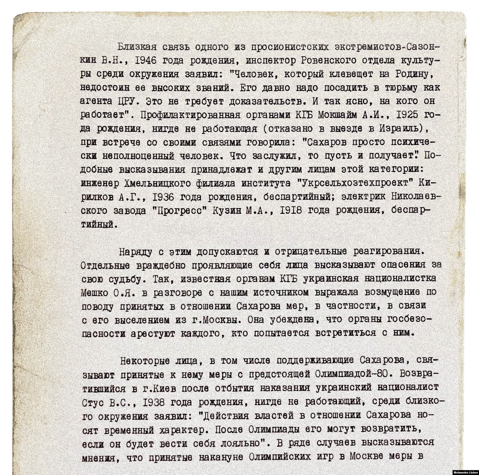 В этом контексте КГБ упоминает украинского поэта и политзаключенного Василия Стуса (в документе он охарактеризован как "возвратившийся в г. Киев после отбытия наказания украинский националист, нигде не работающий"). В кругу единомышленников он говорил: "Действия властей в отношении Сахарова носят временный характер. После Олимпиады его могут возвратить, если он будет вести себя лояльно". Несколько месяцев спустя самого Стуса арестовали – как считается, в рамках той же волны репрессий перед Олимпиадой. Поэт был осужден на 10 лет лагерей и на свободу уже не вернулся – он умер в лагерном карцере в 1985 году.