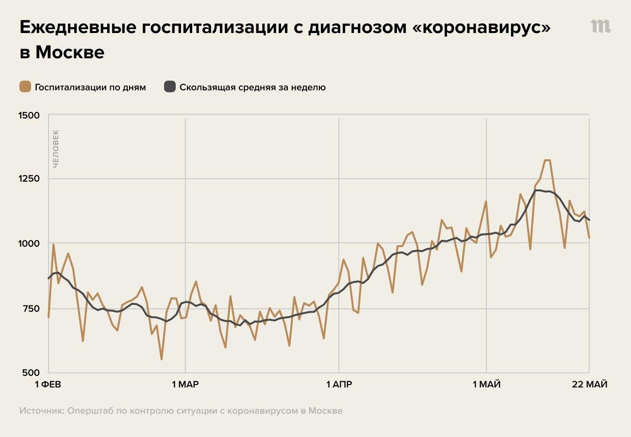 Ситуация с коронавирусом в Москве в последние дни стабилизировалась. После резкого роста в середине мая числа госпитализаций с диагнозом коронавирус (это один из реально объективных и оперативных показателей заболеваемости) случилось их небольшое снижение. Возможно, это следствие длинных выходных на майские праздники, специально организованных властями для борьбы с надвигающейся на город третьей волной эпидемии: часть из тех, кто уехал на дачу в начале мая, не заразился и не попал в больничные сводки через пару недель. Между тем, неясно, какой будет дальнейшая динамика эпидемии. Проблемы, способствующие возникновению новых вспышек заражений, не устранены: в городе почти остановилась вакцинация; доля тех, кто имеет иммунитет к вирусу, скорее всего недостаточна для того, чтобы остановить эпидемию. При этом в городе уже давно фактически не действуют никакие меры, ограничивающие контакты между людьми.