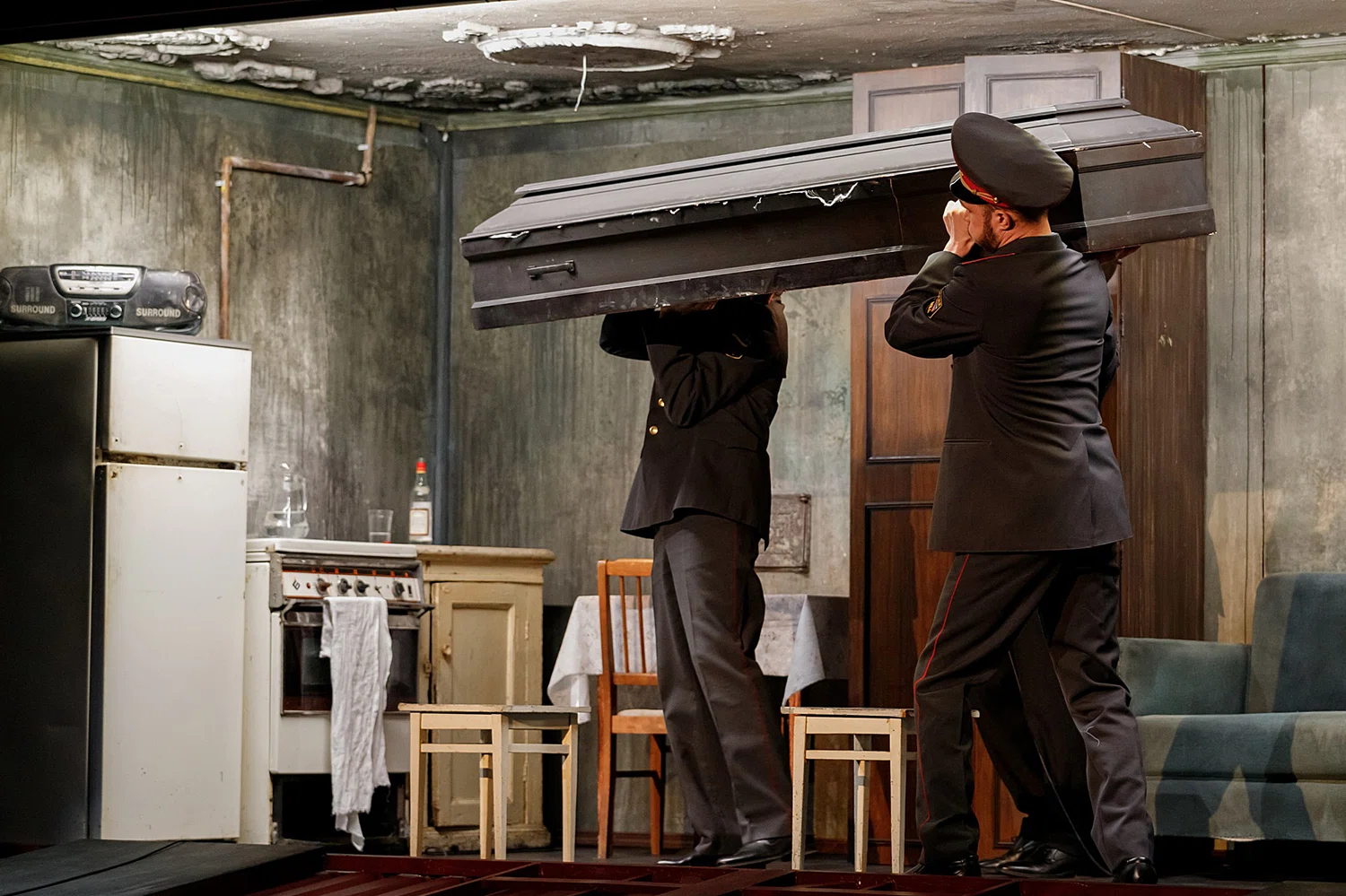 Жена героя, ее тетка, главный друг и главный покровитель — серьезные актерские работы Василисы Алексеевой, Сергея Еликова, Петра Семака и Никиты Барсукова. Сатира на сцене — трудная вещь, но артисты с блеском осваивают карикатурные рисунки ролей, и возникает мрачноватое обличье советского времени, его острые типажи, физически ощутимая духота.