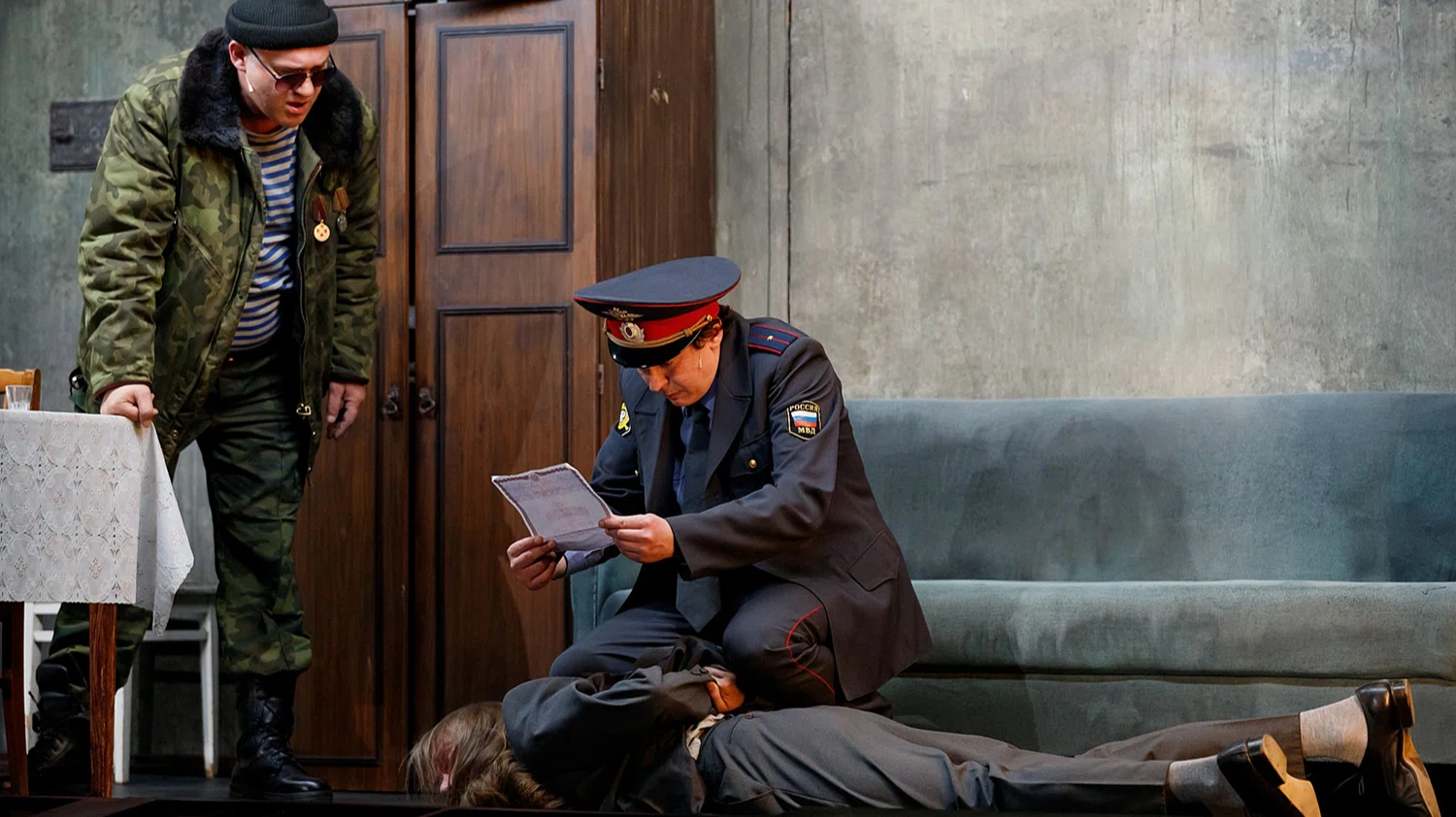Сцены допросов в участке, где свидетельские показания выбивают из беззащитного, бессловесного дворника (Камиль Хардин), сцена, где крупным планом дано лицо героя, которого пытают бутылкой из-под шампанского, сцены разборок генерала-вора Варравина (Андрей Кузин) с героем спектакля — выстраивают отчетливо социальный контекст и отсылают прямо в наше сегодня.