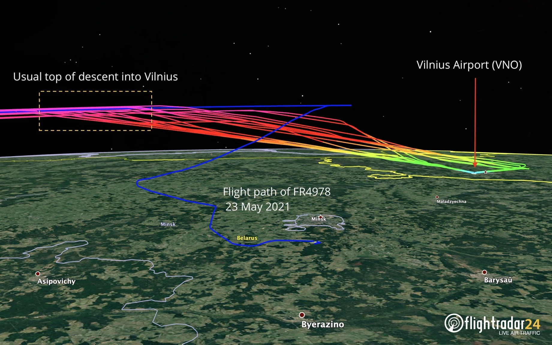 «Пилоты всегда начинали снижение с крейсерского эшелона за 177 километров до Вильнюса, но в этот раз пилоты шли в сторону Литвы без снижения и сброса скорости, на крейсерском эшелоне FL 390 и крейсерской скорости, т.е. фактически уходили от преследовавшего их истребителя», — прокомментировал ситуацию с рейсом Афины — Вильнюс Ryanair авиаэксперт Вадим Лукашевич.